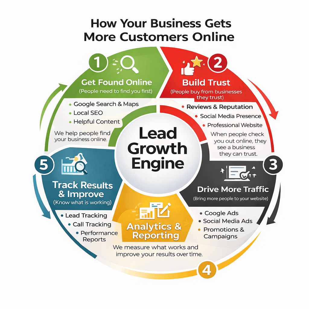 The Digital Growth Engine combines the critical elements every business needs to thrive online, conversion-focused websites, industry-specific SEO, targeted PPC, engaging social media, and reputation management, all seamlessly integrated into one powerful system.
